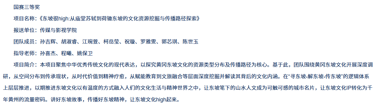 作为国内规模最大、水平最高、影响最广的大学生顶尖科技竞赛,本届竞赛共吸引来自全国2700多所高校的40余万件作品、300多万名学生参赛。在高手如林的比拼中,我院团队聚焦东坡文化的深度挖掘与创新传播,用专业实力展现了传媒学子的青春风采。