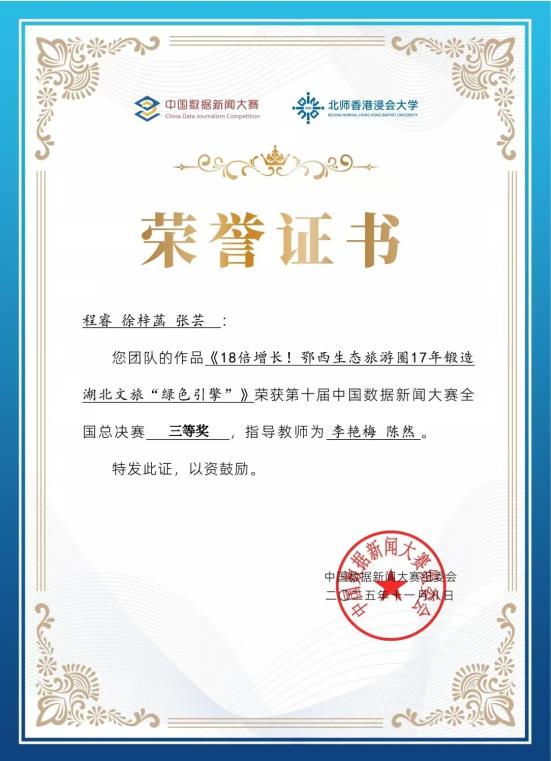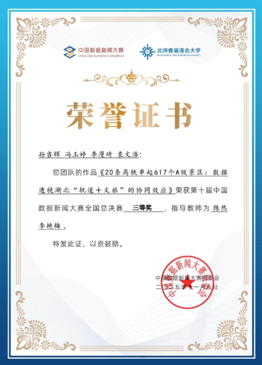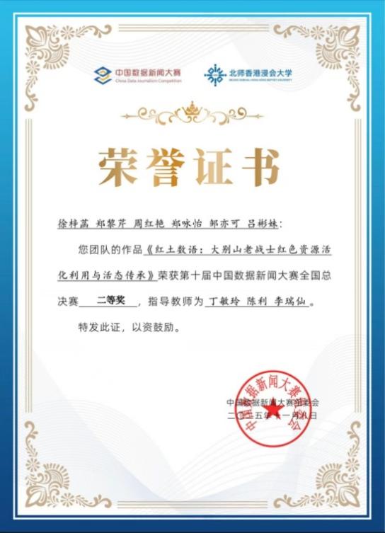 11月8日,第十届中国数据新闻大赛暨首届AIGC应用大赛全国总决赛近日在北师香港浸会大学(珠海)落下帷幕。黄冈师范学院传媒与影视学院学子在比赛中表现优异,共斩获全国一等奖1项、二等奖2项、三等奖6项、优秀奖1项,展现出扎实的专业功底和创新能力。