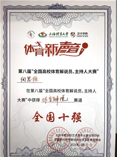 20251122日至23日,第八届全国高校体育解说员、主持人大赛在上海体育大学圆满落幕。我院播音与主持艺术专业2404班向思源同学凭借扎实的专业功底、鲜明的解说风格与稳健的现场表现,在体育解说赛道层层突围,成功闯入全国总决赛并跻身十强,创下我院学子在该项赛事中的历史最佳战绩,为学院赢得了荣誉。