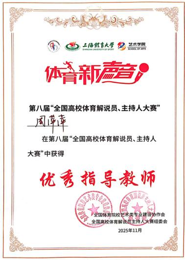 谈及指导过程,周萍萍老师欣慰地表示:“向思源同学的成功绝非偶然,他不仅有扎实的专业基础,更有对体育解说的执着热爱和肯下苦功的钻研精神。备战期间,我们一起分析经典赛事解说案例,打磨每一个表达细节,反复模拟临场突发情况,就是希望他能在赛场上将专业能力与个人风格完美结合。体育解说不仅需要流畅的语言,更需要对体育精神的深刻体悟和快速反应能力,这次比赛让他在实战中实现了专业成长,也印证了‘实践是最好的课堂’这一教学理念。”