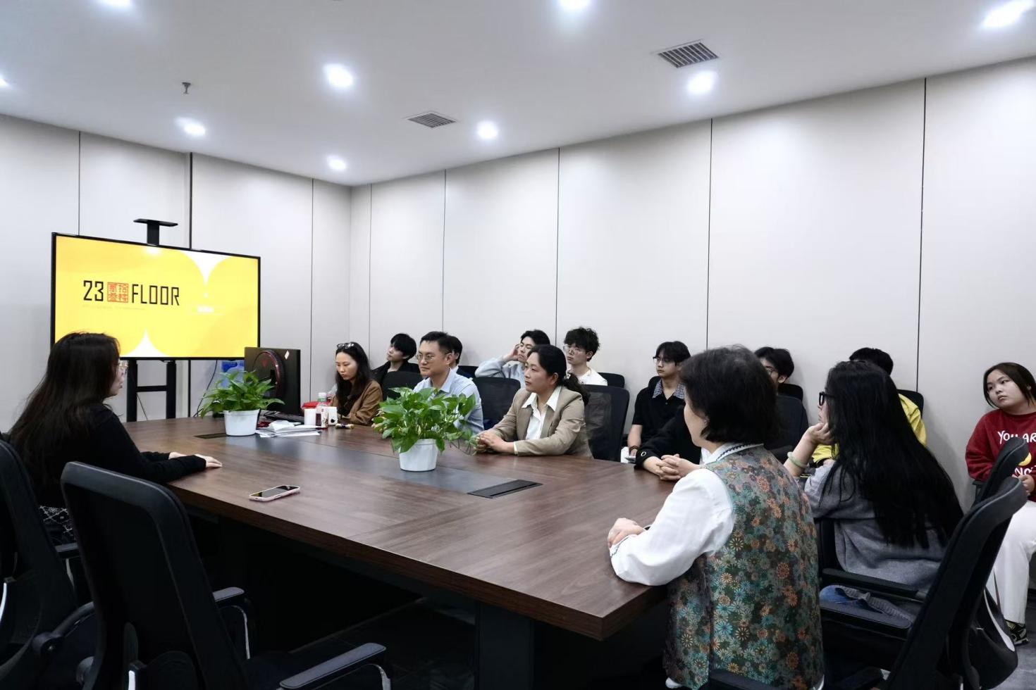 下午,师生团队紧接着前往贰拾叁楼文化传媒有限公司开展调研学习,公司负责人罗佳为全体师生详细讲解短剧行业发展历程,以及公司全链条式的行业配套布局,让师生对短剧赛道的行业生态有了全面认知。
