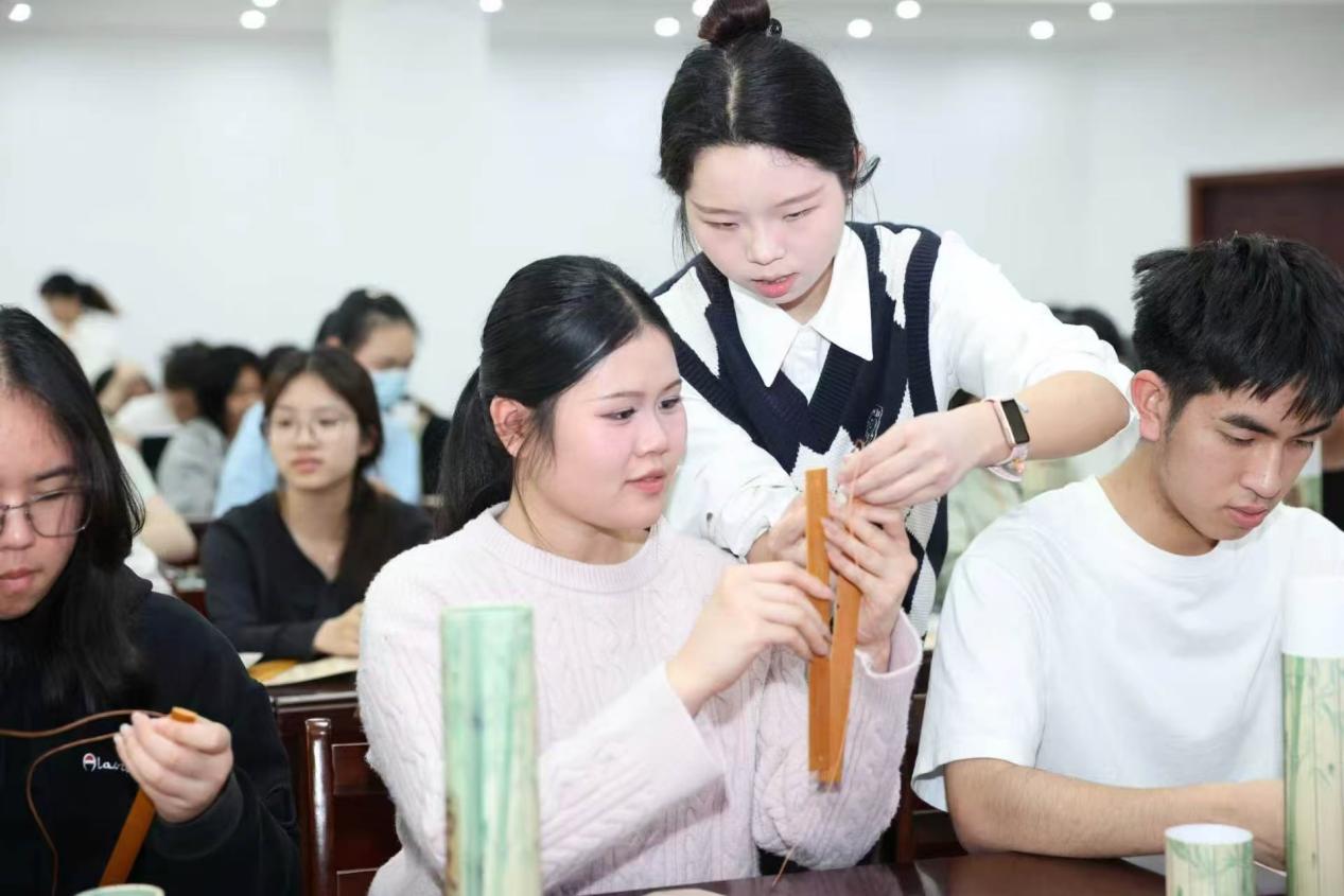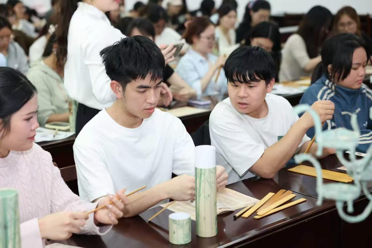 知识讲解之后,“巧手制竹简”环节让历史从听讲变为触摸。师生分组上手,从穿绳、编联到临摹秦隶,一步步还原古人技艺。有留学生一边写一边用母语给身旁同学翻译竹简上的内容,还有人用双语在竹简上写下“文化无国界”。