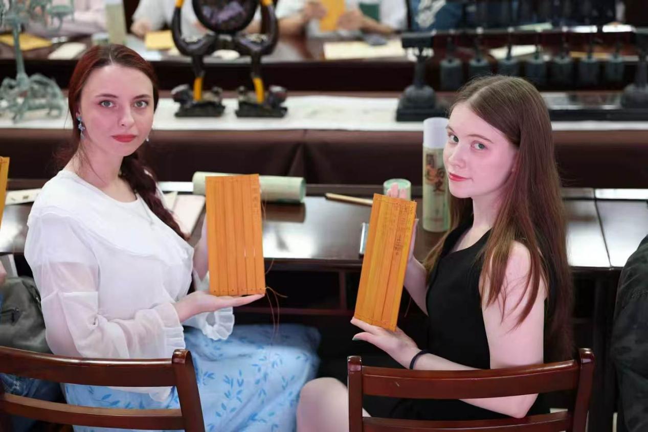 图6 俄罗斯留学生手持竹简作品,分享文化体验心得
